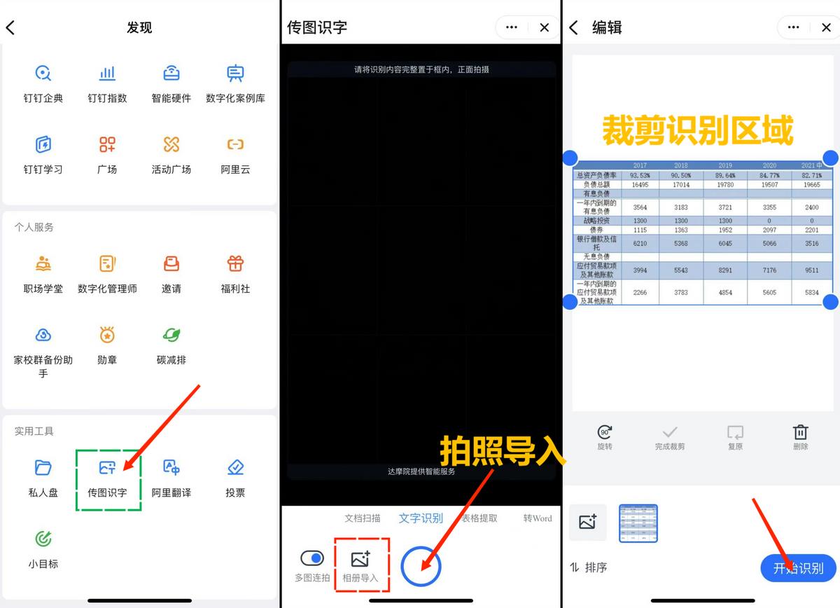 钉钉是我们日常办公必不可少的协同沟通软件,除了智能移动办公,他也能对图片进行文字识别。打开钉钉APP,点击界面下方【我的】,选择【发现】选项,下滑找到【实用工具】,选择【传图识字】,这里从手机相册中导入图片,也可以用手机拍图识别,导入后框选需要识别的图片区域点击【开始识别】即可,识别完成后可以将识别结果复制、转发、翻译或导出。
