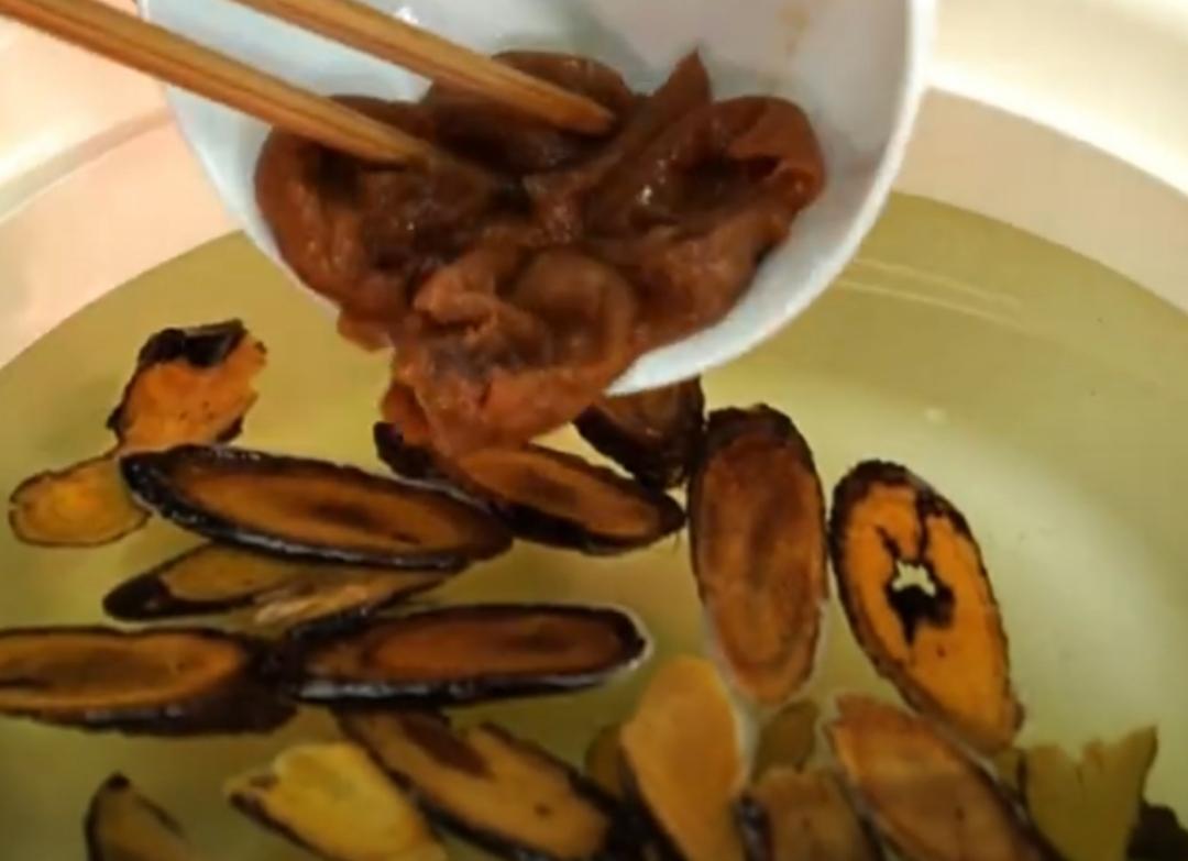 1、锅中加清水,把甘草放进锅中,咸梅用勺子戳烂,放进锅中跟甘草一起煮,大火烧开转中小火,熬至汤汁浓缩为原来的一半,加入白糖搅拌均匀,关火滤出甘草汁,晾凉备用