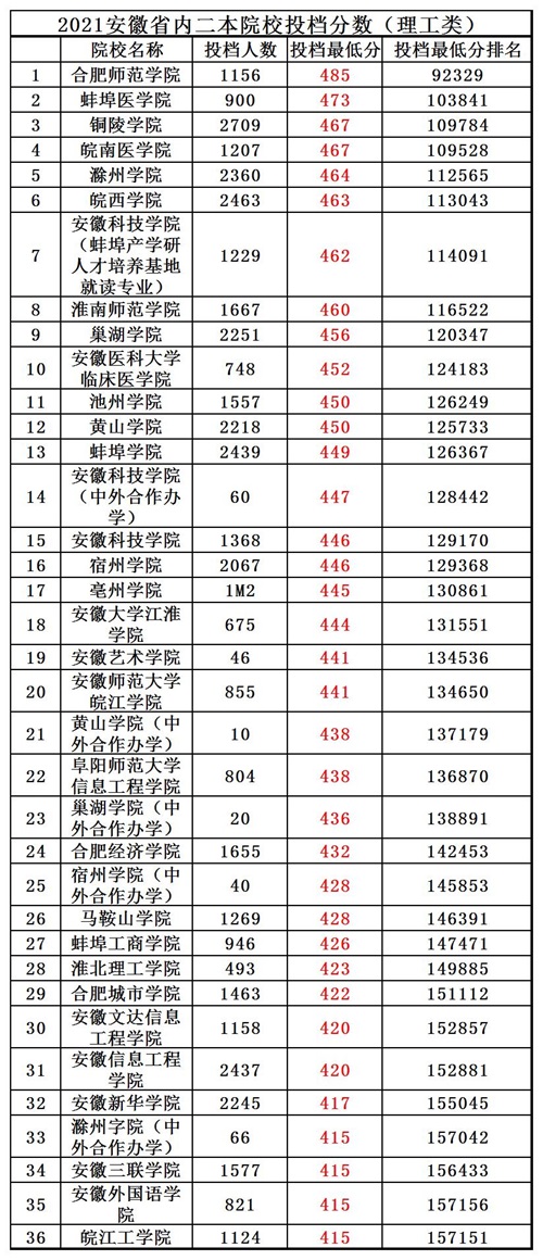 为了帮大家对安徽二本院校及其实力排名有一个大致的了解,小编参照2021年安徽高考二本院文、理科校投档分数表。