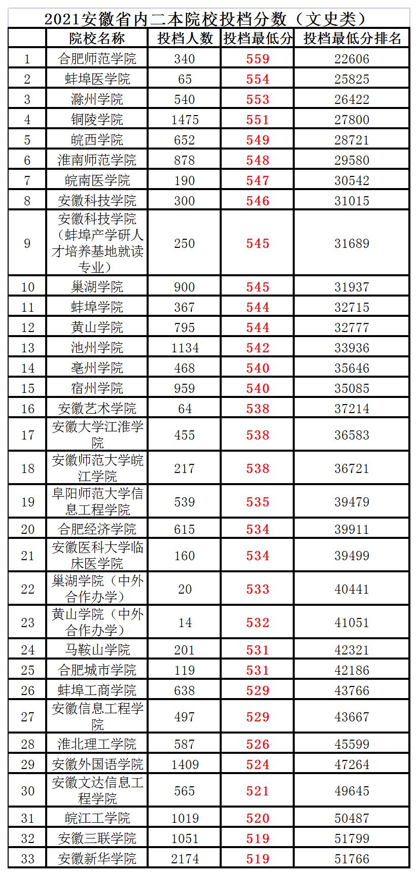 所以安徽文科投档分数表上有33个招生院校,其中包含了安徽科技学院(蚌埠产学研人才培养基地就读专业)、巢湖学院(中外合作办学)、黄山学院(中外合作办学)3个独立计划。