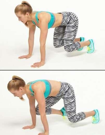 2.攀山步。四肢撑地,双腿弯曲90°。左腿不动,右腿向胸前靠近保持15秒,右腿迅速收回原位,换左腿保持15秒。