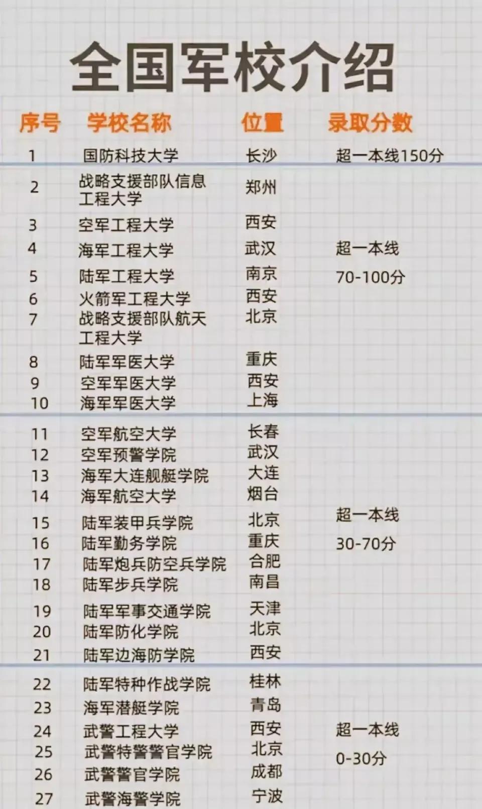 前世今生。国防科大,全称是中国人民解放军国防科技大学,是中央军委直属、唯一的军队985高校(我国军校有44所,其中面向高考生的有27所,见附件),誉为“军中清华”,其录取分数线一般超过一本线150分,各省600分以上接近清北线。其前身是1953年陈赓大将创建的哈尔滨军事科学院—哈军工,1969年因中苏关系恶化,北方及沿海高校迁内地(俗称三线),哈军工主体迁至长沙,剩下的组建如今的哈尔滨工程、南京理工、陆军装甲兵等5所军校。