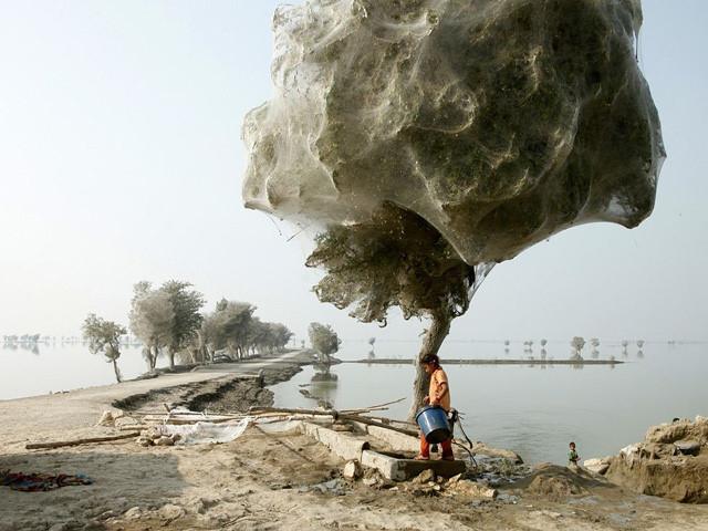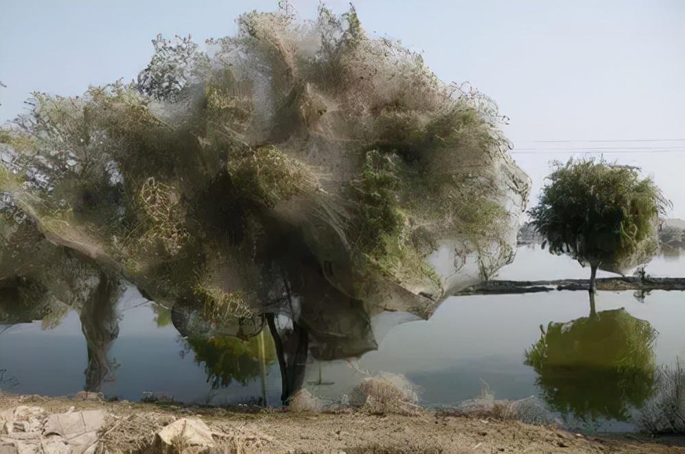 英国《每日邮报》3月26日报道,在巴基斯坦东南部的信德省,为逃避被洪水淹没的厄运,数百万只蜘蛛爬到树上筑起了窝,并用它们纤细的丝网把树木包裹得严严实实。