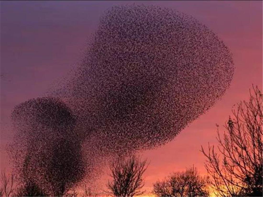 在丹麦的夏季,大约在日落前半小时,成群结队数以百万计的欧洲星椋鸟从四处聚集在一起,黑压压地一片,在空中结成一支编队。