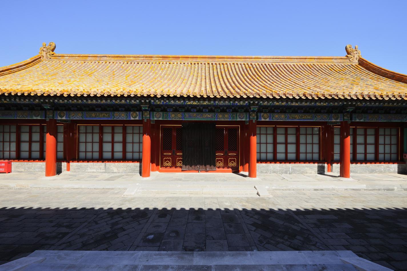 东西有配殿各3间,明间开门,黄琉璃瓦硬山式顶,檐下饰旋子彩画,崇祯七年将东西配殿更名贞顺斋、明德堂。