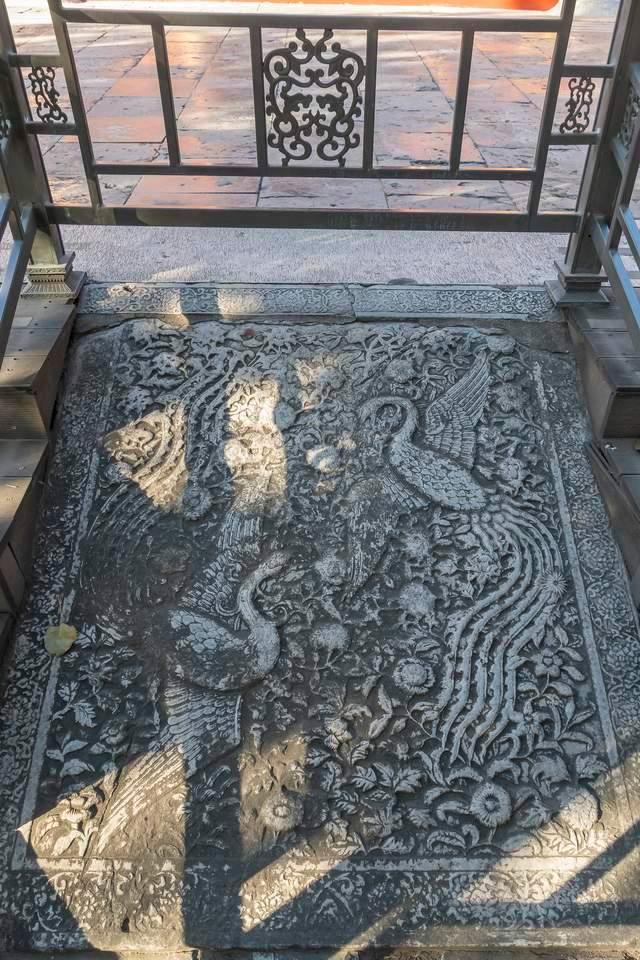 正殿月台前垂带踏跺中间的丹陛石没有汉白玉栏杆,上面刻的是双凤。