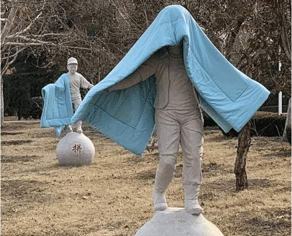 不知何时起,各大校园都开始流行在雕塑上晒被子了,下面这两位同学就把自己的被子搭在了两个正在行走的雕塑上。