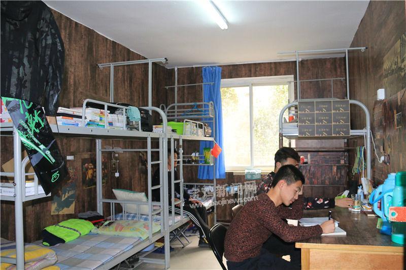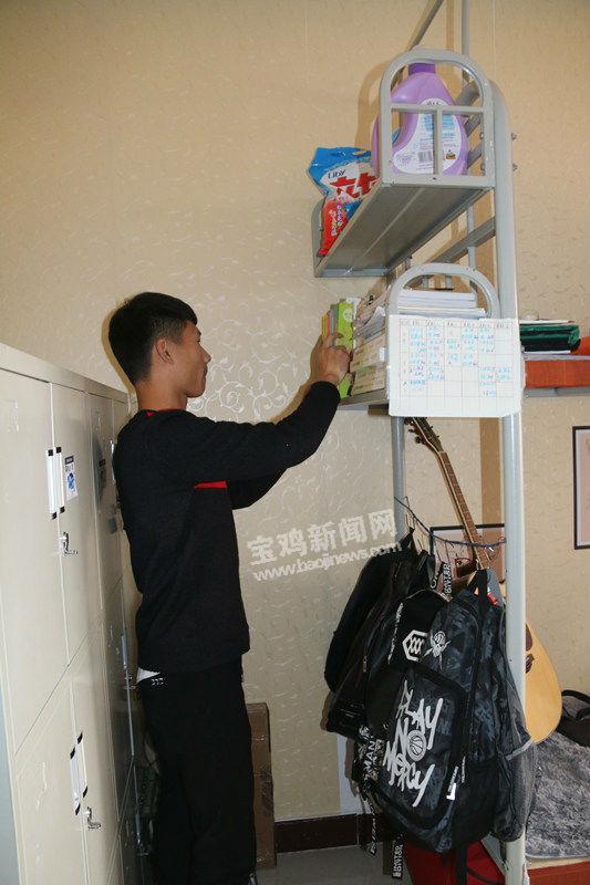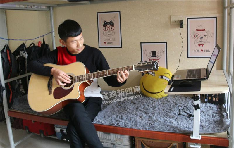 采访中记者看到,一间寝室里一进门有很舒适的“沙发位”,一位同学正抱着吉他“悠哉”,旁边另一位同学则在练书法,文艺范十足。“我们宿舍因为是背光面,所以选用了淡色系的壁纸。将空床位改成了沙发,大家学习、看书更舒适一些。我们还做了书架把书都放在一起,书包也统一挂在书架下面。老校区的住宿条件不如新校区好,这样一改,感觉宿舍更宽敞、更舒适了,也更有个性。”宿舍长孙正友向记者介绍道。