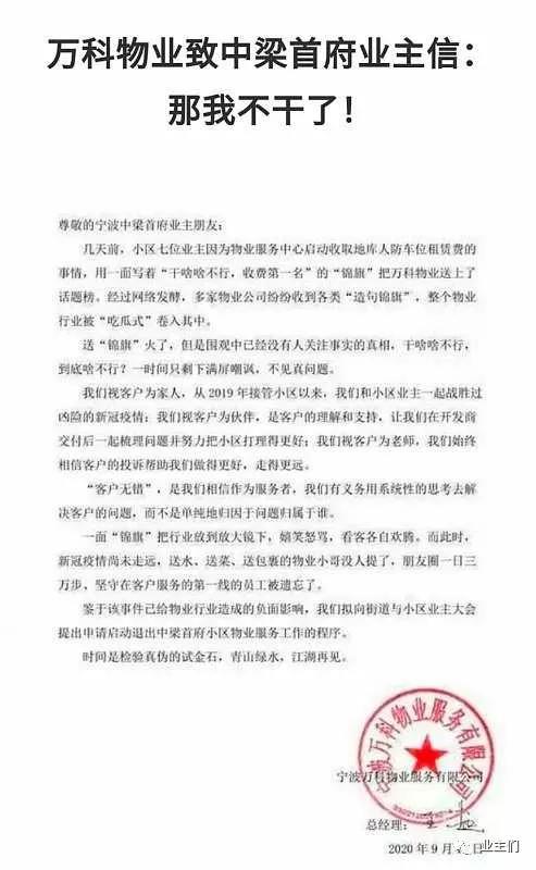 当然必须不是当事小区业主和物业公司服务人员,也没有参与到物业纠纷中去,无法对具体小区案例作出具体判断;但是笔者可以理解成为至少是部分业主因对万科物业积累怨恨凝聚成了“造句锦旗”,而万科物业也对小区业主利用自己品牌将小区个案炒作成社会热点不满化作了一纸高调退出的声明。