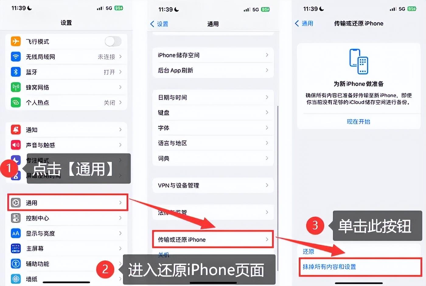 步骤2:在【通用】中找到【传输或还原iPhone】,进入该页面后点击【抹掉所有内容和设置】,然后根据提示进行后续操作即可。