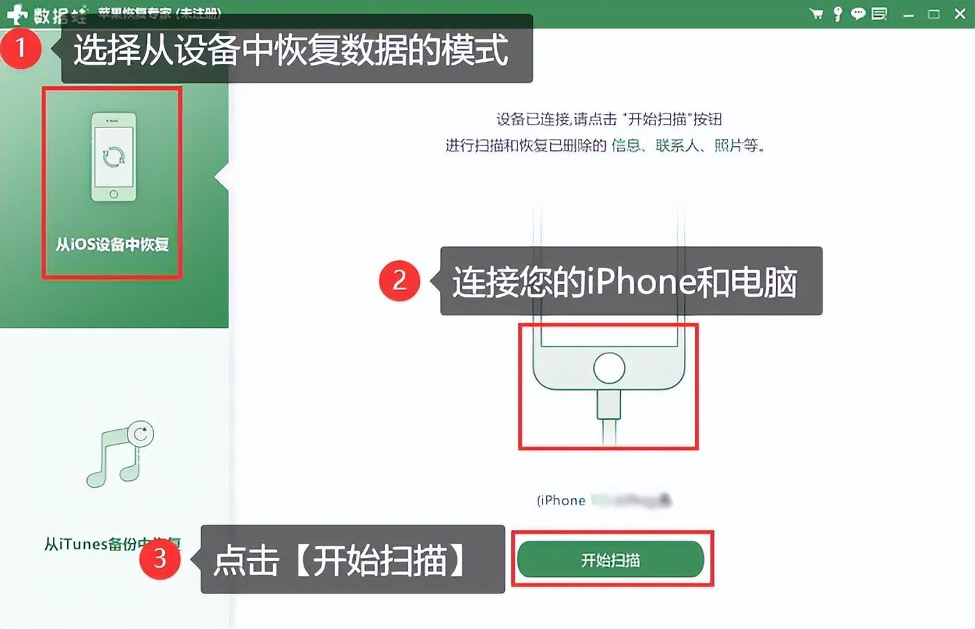 步骤2:选择【从iOS设备中恢复】,然后按照提示连接您的iPhone和电脑,并点击【开始扫描】按钮。