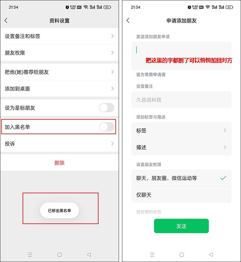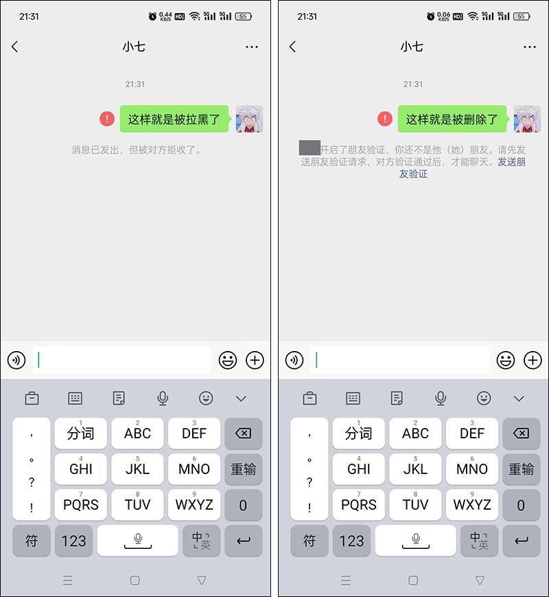 以上就是微信被拉黑和删除的区别,当然,除了区别之外,两者有一个最大的共同点,那就是当我们被微信好友拉黑或删除后,我们都没法直接给对方发消息了,要是无足轻重的人,发不了消息也无所谓,拜拜就拜拜,可有的是对我们来说很重要的人,我们还是希望可以继续和对方沟通解释清楚,让对方别再生气,重新恢复关系,那还有什么方法可以在被拉黑、删除后强制聊天吗?自然是有的。