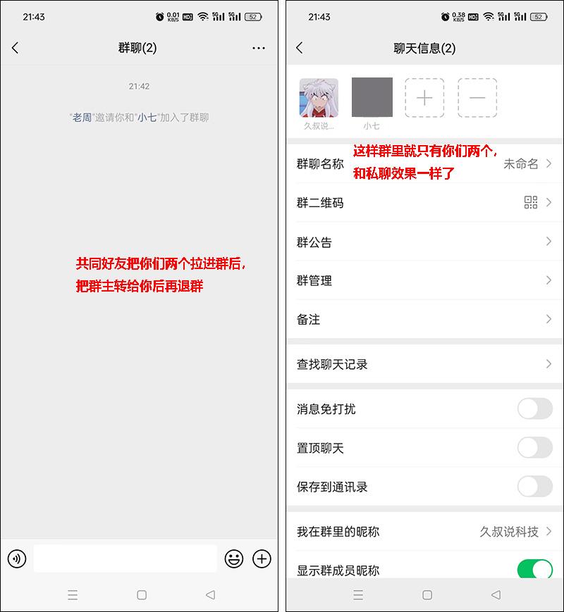被拉黑、删除后强制聊天的方法:需要你们有一个共同的微信好友,然后让共同的微信好友点击微信右上角的【+】-【发起群聊】,选择你们两个,这样就会建成一个有你们三个人的微信群,也就是说让共同的微信好友把你们两个拉到一个微信群里,然后共同的微信好友点击微信群右上角的【…】-【群管理】-【群主管理权转让】,选择你,把微信群群主转给你之后,共同的微信好友退出群聊,这样群里就只有你们两个了,你就可以拥有一个只有你们两个人的空间,发消息给对方解释了,建议一次性把想说的话打出来再发出去,免得对方气头上,你发一句话对方就退出微信群了,你想解释的话对方也都看不到了。