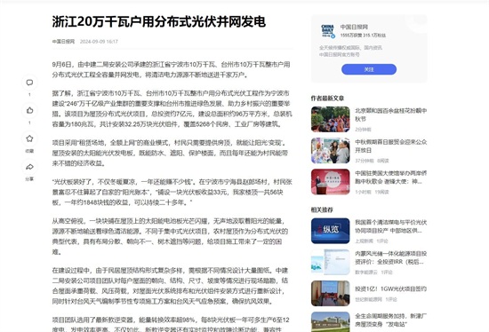 信息来源:中国日报网-《浙江20万千瓦户用分布式光伏并网发电》-2024-09-09