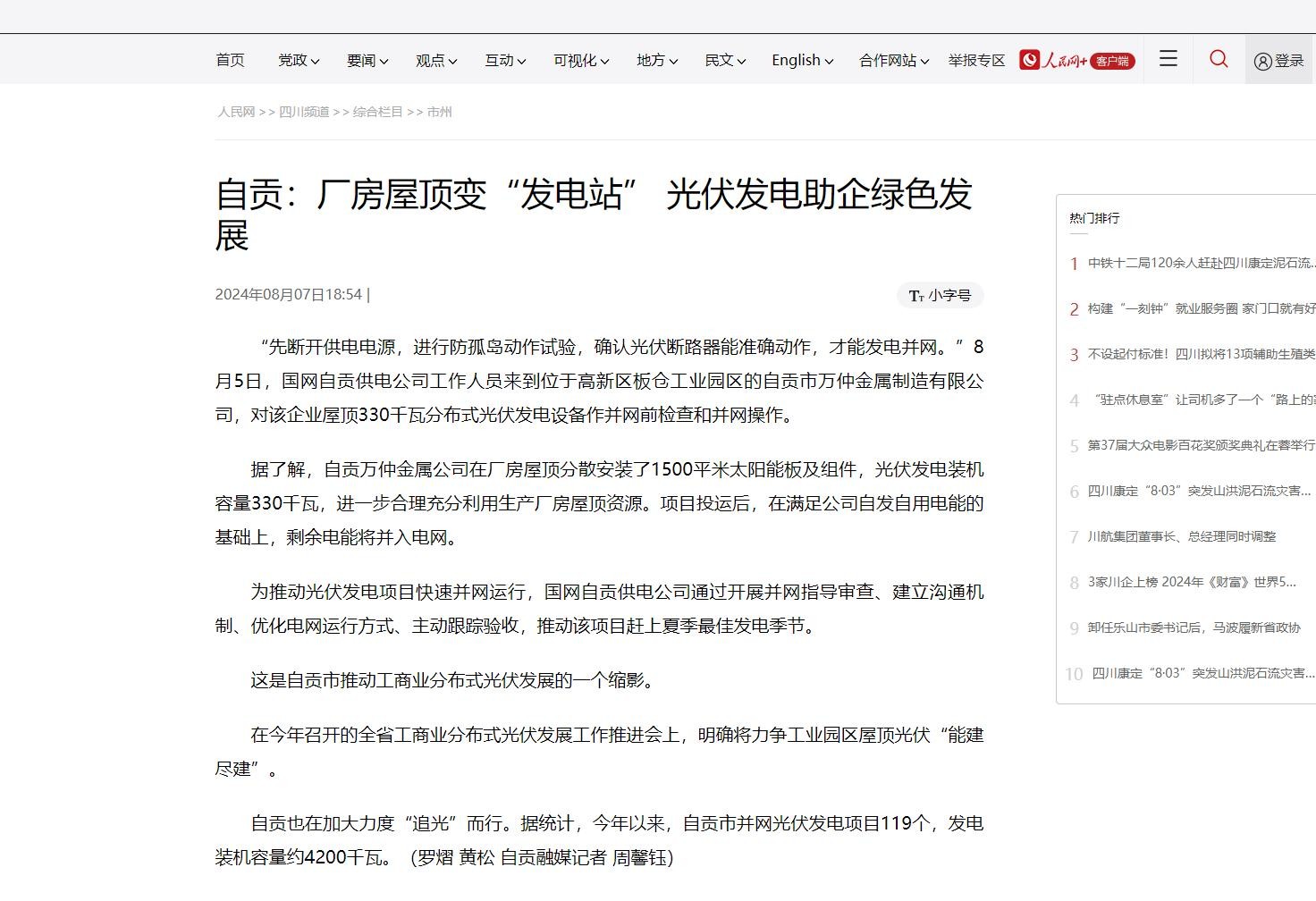 人民网-《自贡:厂房屋顶变“发电站” 光伏发电助企绿色发展》-2024-08-07