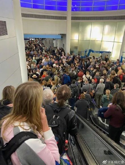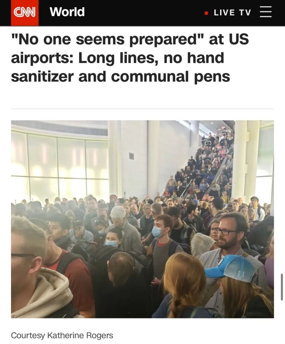 随后,美国各大机场都出现了大量乘客滞留,排长队等待海关检查、等待病毒筛查,有人排队10个小时。