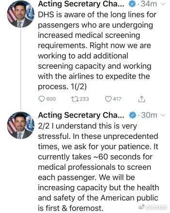 随后,美国国土安全部也进回应称已经注意到此事,并解释称:“因为乘客排长队接受医学检查的要求越来越高,目前,正在与航空公司合作,以加快这一过程。我们需要你们的耐心。目前,医疗专业人员对每位乘客进行检查大约需要60秒。我们将提高能力,但美国公众的健康和安全是最重要的。”