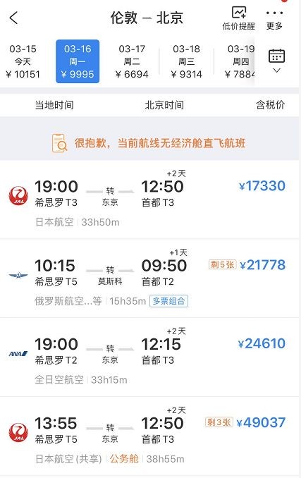 基金君查看携程机票,从伦敦回深圳的机票近期已无经济舱直飞航班,而且单程机票最低1万7起步。