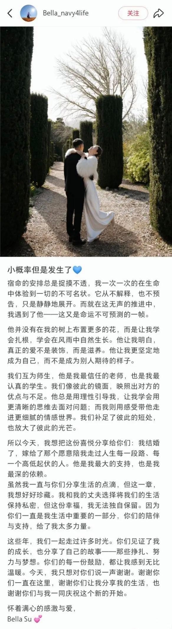 可就在今年的3月18日,Bella却突然发文,宣布了自己结婚的喜讯。