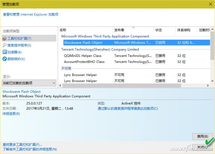 在IE中按下Alt+X组合键显示“工具”菜单,选择“安全→ActiveX筛选”命令,这种方法只适合于IE浏览器(图5)。此外,还可通过IE工具菜单下的“管理加载项”进入加载项管理窗口,选择控件“Shockwave Flash Object”,点击右下方“禁用”,再点击“关闭”(图6),它针对所有浏览器发生作用。这样,由此插件引起的所有浏览器的假死问题就都解决了。