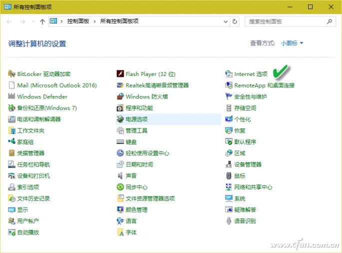 右键单击开始按钮并选择“控制面板”,将查看方式切换到“小图标”模式,点击窗口中的“Internet选项”。