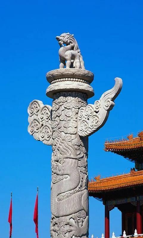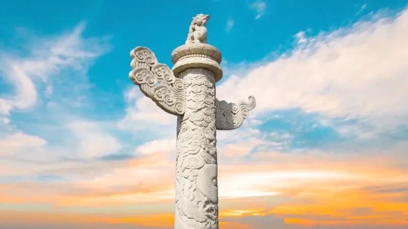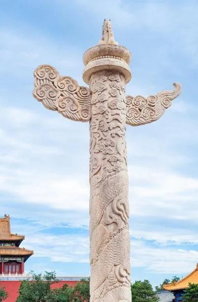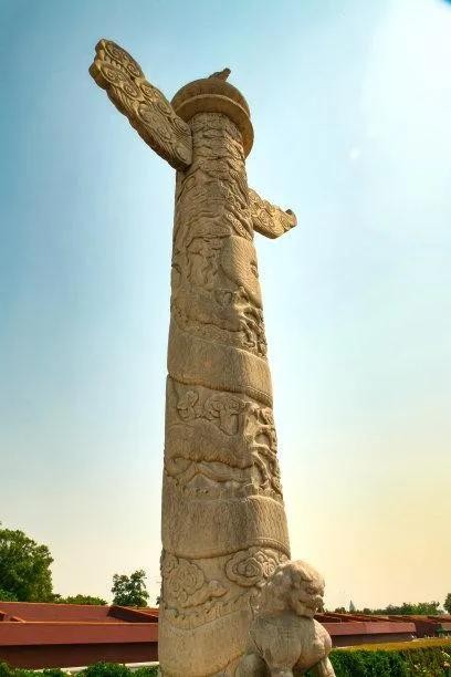 华表又称擎天柱,在汉代时称桓表,是中国古时用以标志或纪念性的建筑物。早在尧、舜时期便已有之,传说帝尧时代,尧为征集民众意见而设立,古籍中有“尧设诽谤木,今之华表木也”,也就是在木头柱上安放一块横木,设置在交通要道上,意思是让老百姓将意见书写在诽谤木上,体现君王纳谏的诚意。汉代时,华表多为木制,顶上立有白鹤,到了明代逐渐用石柱代替了木柱。