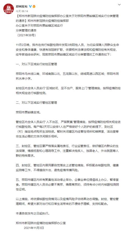 11月2日晚,我市在例行核酸检测中发现3例阳性人员,为切实保障人民群众生命安全和身体健康,快速有效阻断扩散,依据相关法律法规和疫情防控有关规定,经专家组综合研判,现就荥阳市贾峪镇区域实行分类管理的工作通告如下: