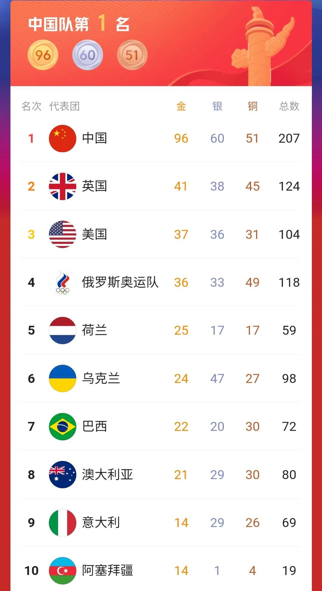 96金,61银,50铜。共计207枚奖牌。这是本届中国残奥会代表团交出的亮眼成绩。中国队已经连续五届残奥会取得奖牌榜第一。让我们用最诚挚的敬意向他们表示感谢。让我们用最热烈的祝福向他们表示祝贺。中国残奥会代表团运动员顽强拼搏锐意进取的态度。向我们完美诠释了什么是中国精神!感谢他们为祖国所做的付出和努力。值得我们每一个中国人骄傲和自豪。