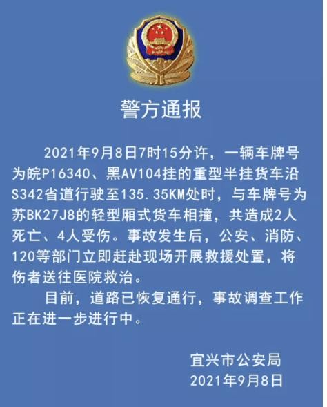 据“平安宜兴”微信公众号9月8日通报,今日7时15分许,一辆车牌号为皖P16340、黑AV104挂的重型半挂货车沿S342省道行驶至135.35KM处时,与车牌号为苏BK27J8的轻型厢式货车相撞,共造成2人死亡、4人受伤。事故发生后,公安、消防120等部门立即赶赴现场开展救援处置,将伤者送往医院救治。