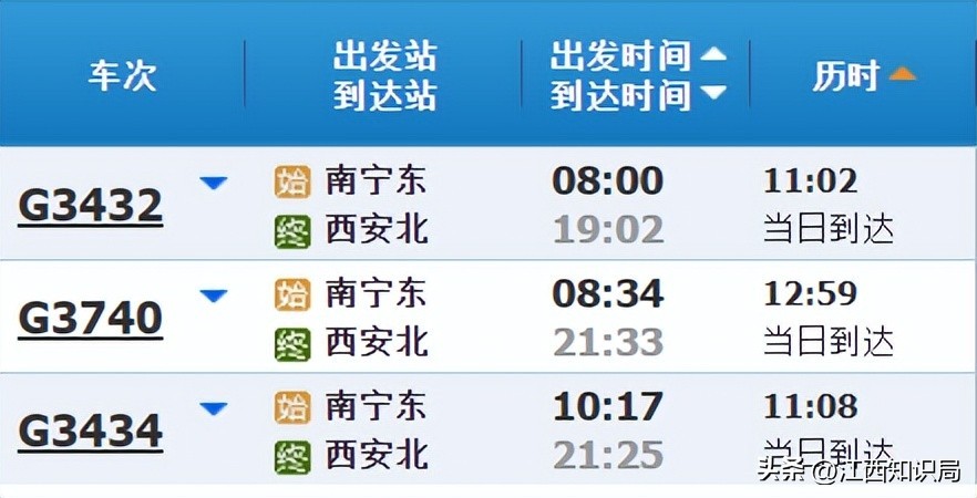 目前,南宁至西安每天有3个车次的高速列车,其中,G3740次列车耗时最长,用时为12小时59分钟;G3432次列车耗时最短,用时为11小时2分钟。