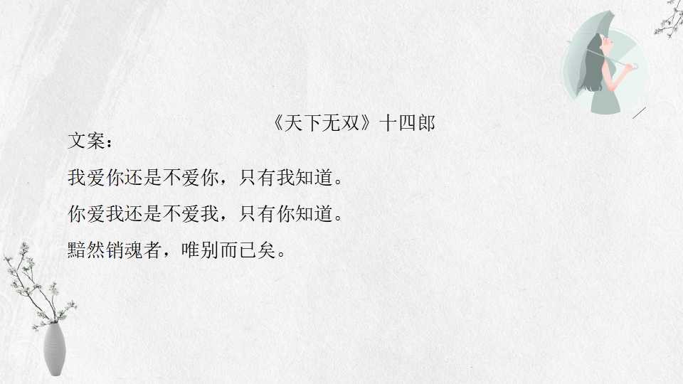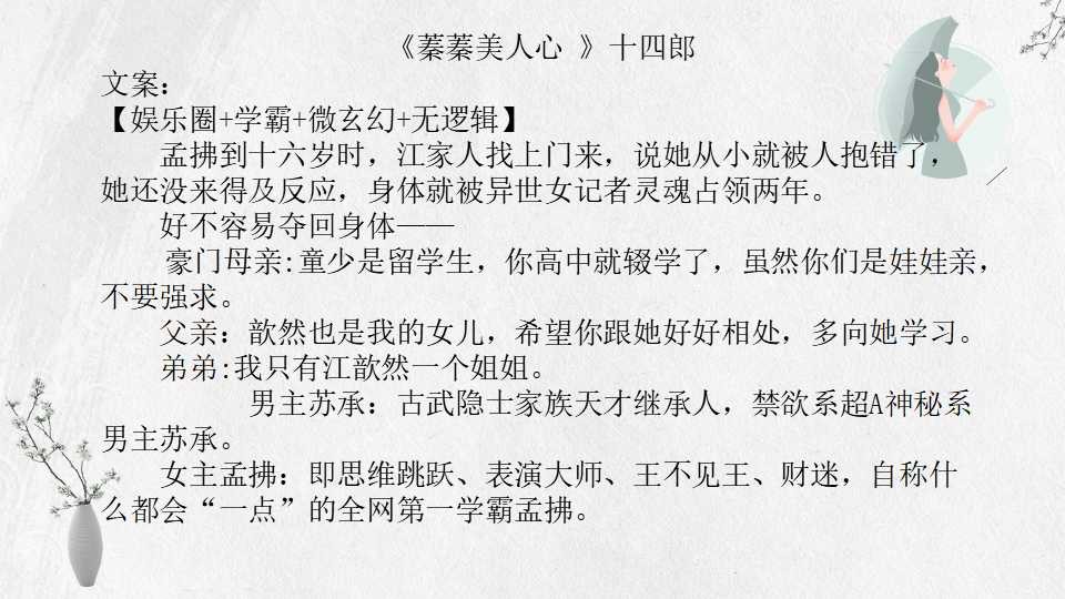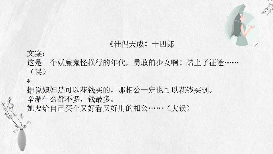 十四郎,觉得十四郎的名字听起来像男生,披着十四十四的号写了琉璃和跑江湖两篇文。她的小说多以古言仙侠为主,剧情流畅,文笔清新,人物饱满。早期还有个马甲号“半袖红雪”,这个马甲下的文大家自己搜吧。她的小说,除了寥寥无几的两篇现代文,其余作品都是古言仙侠,喜欢此类文的小伙伴不要错过。