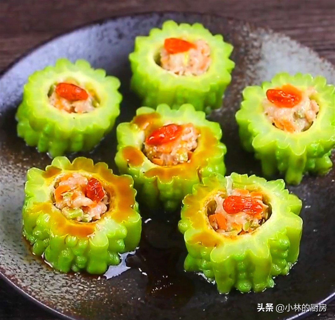 猪肉糜中加入适量的食盐,料酒,生抽,葱花,姜末搅拌均匀待用。苦瓜洗净后切成约1.5厘米厚的片,然后将中间的瓤挖去,害怕太苦的朋友可以将贴在苦瓜内壁上的白膜也清除掉。将调好的肉馅取出适量依次填进苦瓜片里,然后再点缀一个枸杞,最后上锅蒸十分钟即可出锅。出锅后淋上少许生抽即可享受美食了。