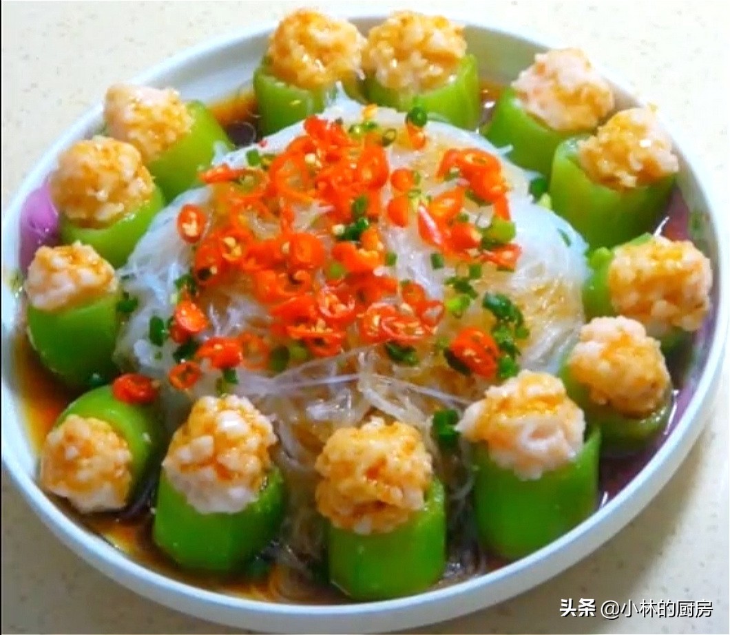 丝瓜去皮洗净后切成大小均等的段,将中间的瓤挖去不用,注意不要挖通。虾仁剁碎后,加入适量的料酒,胡椒粉,食盐拌匀;然后将调好的虾仁装入挖空的丝瓜里。将装了虾仁的丝瓜在盘子里摆好,中间铺上泡软的粉丝,开水上锅蒸6分钟即可出锅。撒上葱花和小米椒,浇上蒸鱼豉油,最后淋上热油激发出葱花和小米椒的香味即可食用了。