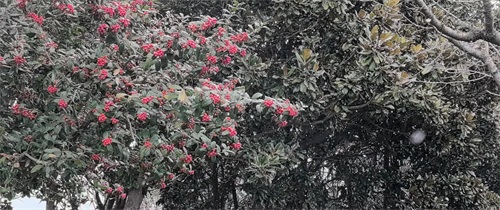 到了冬季,大部分花儿凋零了,漂亮的红叶不见了踪影 ,黄色银杏叶也都衰落了,只有枸骨树依然挂满累累硕果无惧严冬、傲视风雪、比肩红梅超越腊梅,屹立在人们的视线中。