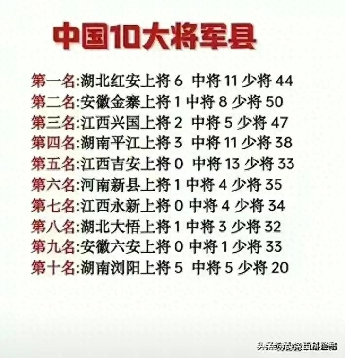 6. 河南新县:新县走出了许世友、李德生等一大批将军,被称为“中将县”。