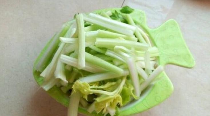 3、里脊肉已经处理完了,那么接下来咱们就处理一下芹菜。将芹菜叶全部摘掉,然后再把芹菜根从根部分离,再放到清水中浸泡清洗,清洗完了之后将芹菜切成大概两厘米长的小段。如果里面有比较粗的芹菜小段的话,咱们再用刀给它分成小一点的丝。切好之后最好再冲洗一遍,冲洗完了再放到一个容器中控干水分。