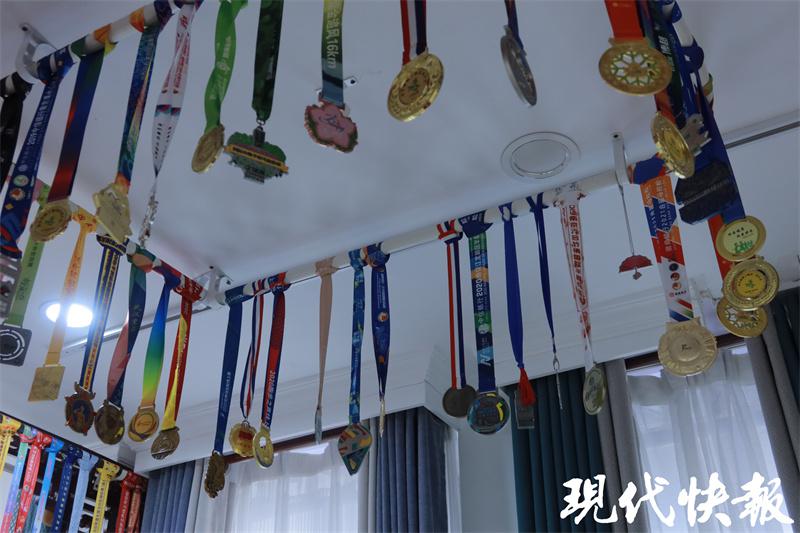 " 对我而言,马拉松就是我放松的方式。和跑友之间也没有利益和感情的纷争,大家都是纯粹的跑步,享受简简单单的幸福。" 周丽向现代快报记者展示了自己获得的各种马拉松奖牌,这些精美的奖牌挂满了周丽店铺门口,展示的不仅仅是荣耀,更是坚韧的意志力。