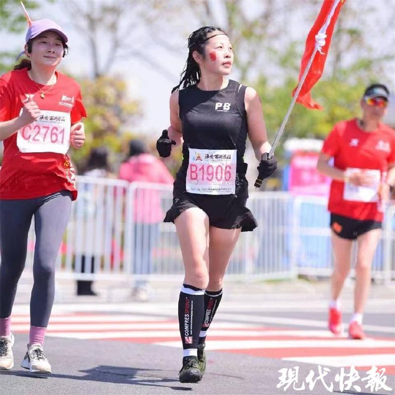 现代快报讯(记者 龙秋利 文 / 摄)在国内各大马拉松赛事的跑道上,你可能会经常看见一个扎着麻花辫、举着国旗的人,那便是周丽。在马拉松赛场上,她是一个护着国旗跑步的女性,而在生活里,她有一家经营了 14 年的窗帘店。虽然今年已经 46 岁,但是周丽的精气神还是像年轻姑娘一样,总是给人以活力满满的感觉。" 我希望我是美好的,也能带给别人美好的力量。" 周丽说。