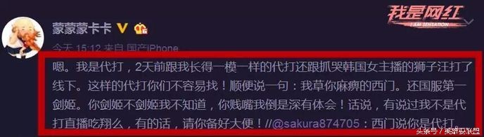 西门,是大家都知道的国服第一剑姬,事情的起因就是有人对卡卡透露,西门在直播的时候说了卡卡不是代打他直播吃屎的话,因此卡卡在微博里怒刚西门,强势回应了一波~