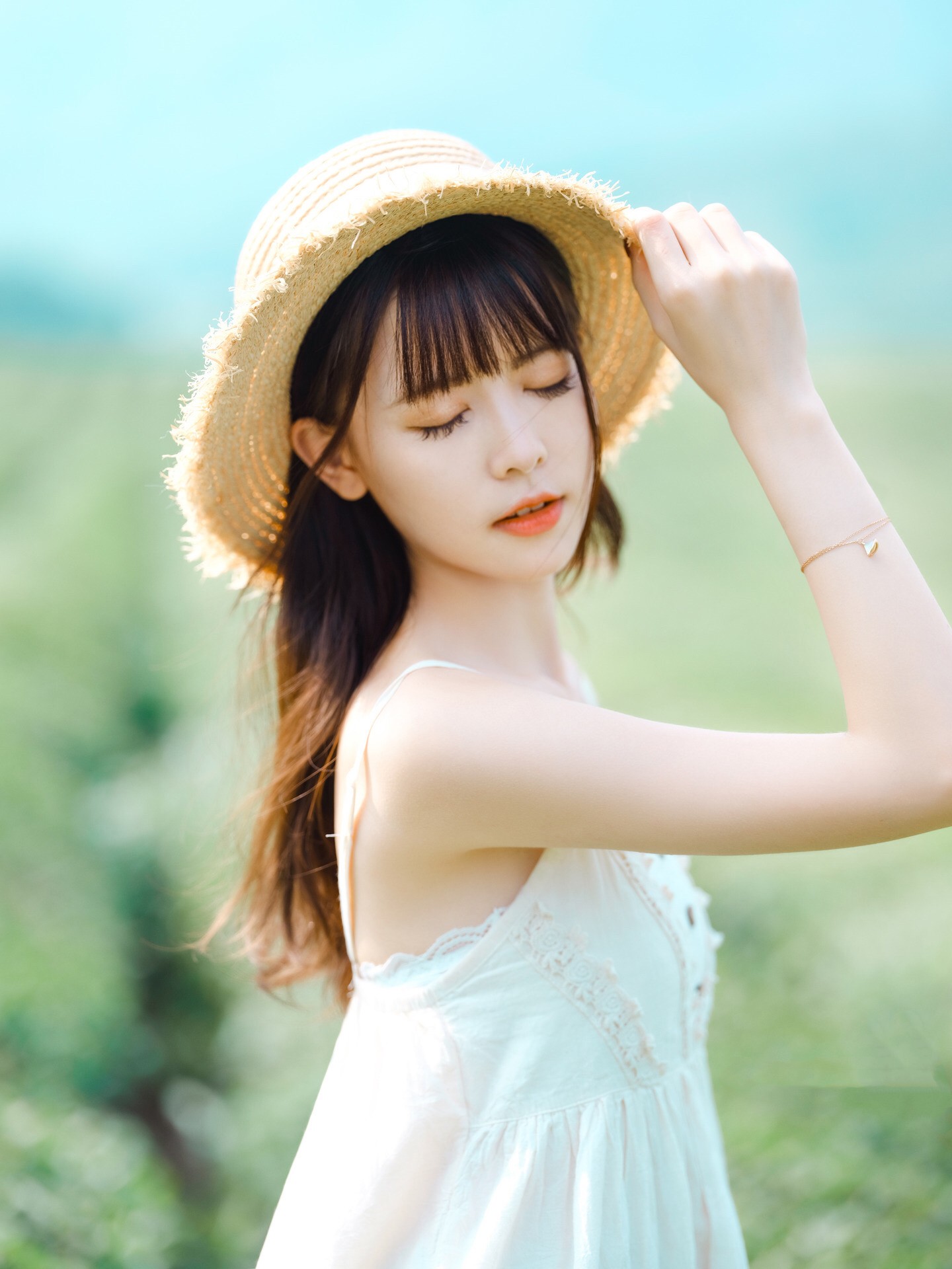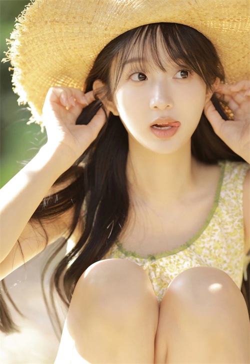 帽子是拍人像摄影时基本都会准备的道具,以半身面对镜头,手拿帽子挡住自己的上半身,这样能避免拍到粗手臂、小肚腩等,实现扬长避短拍美美的照片。