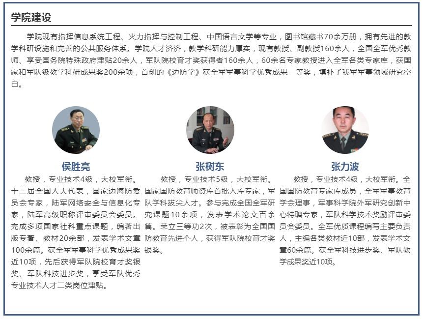 牵头建设军队指挥学学科,参与建设战术学、信息与通信工程、电子与通信工程、网络空间安全、军队政治工作学等5个学科,牵头建设军事指挥和军事装备2个学位领域。