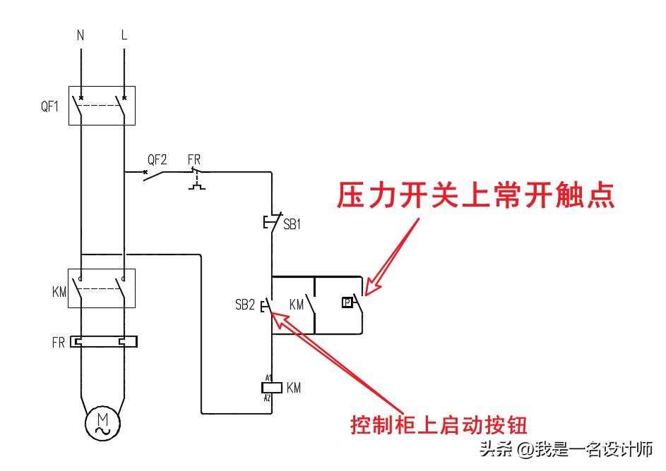 这两组线中有一组是“常开”的另一组是“常闭”的,“常开”的那一组线是去往水泵控制柜的,与水泵上的启动按钮相并连,这样不论是按启动按钮还是压力开关动作都可以直接启泵,下面画个简单电路,示意下压力开关的接线逻辑;