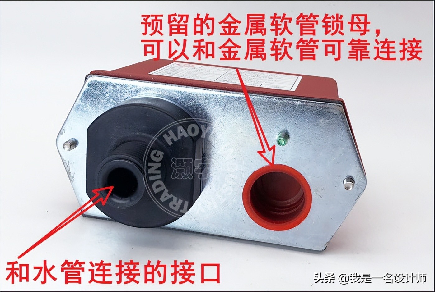 其实上面三种接线都是有问题的,最主要原因就是要么没穿保护管管,要么是虽然穿管了但接线处线缆外漏,造成这种现象的具体原因不是咱施工人员施工水平不行,确实是这款压力开关的产品设计的有问题,这圆溜溜的光滑侧面你出四根线,套管怎么和外壳连接,金属软管也没法使用锁母和护口,只能尴尬的提溜在哪。下面我再上个图大家看一下: