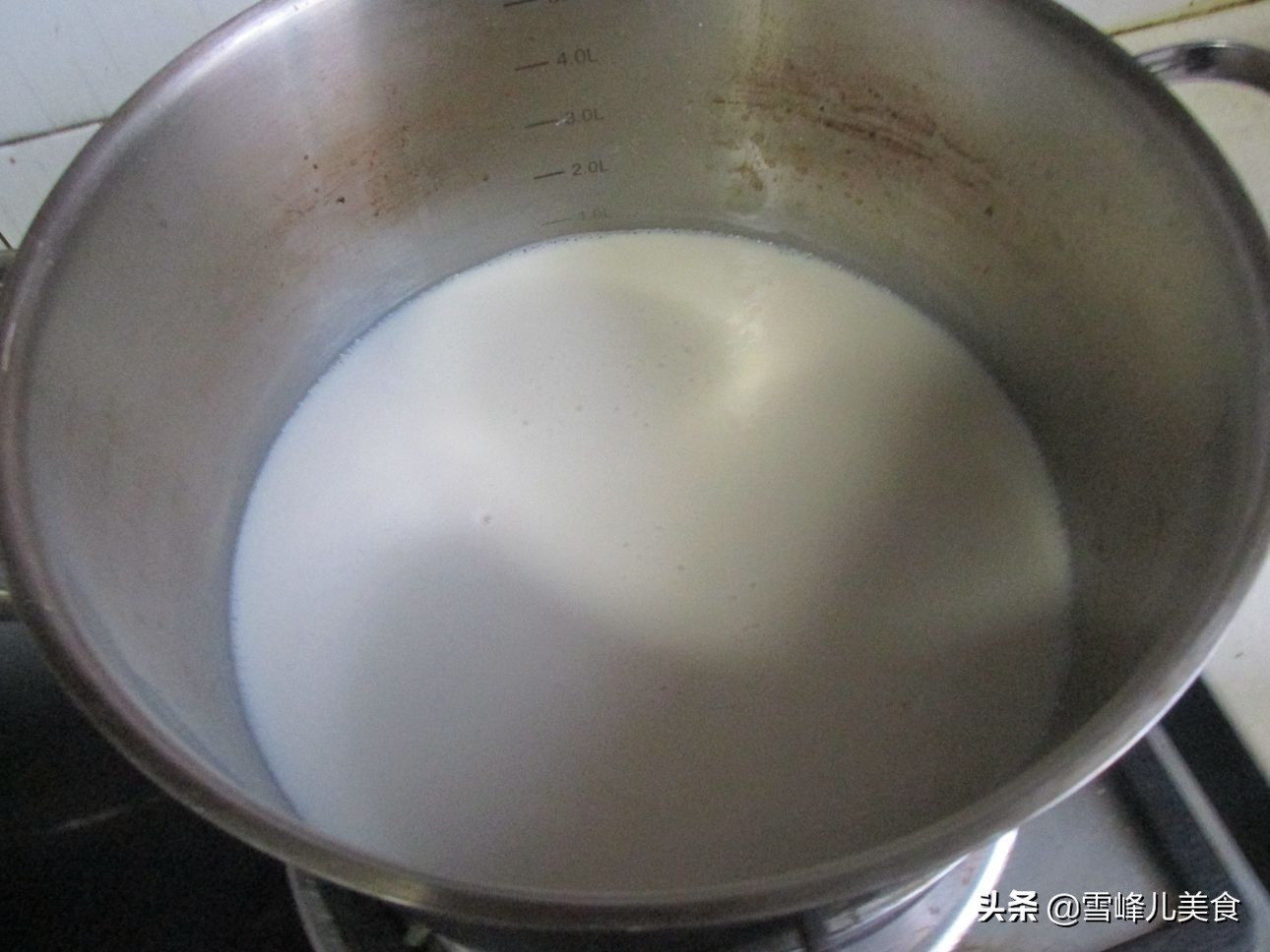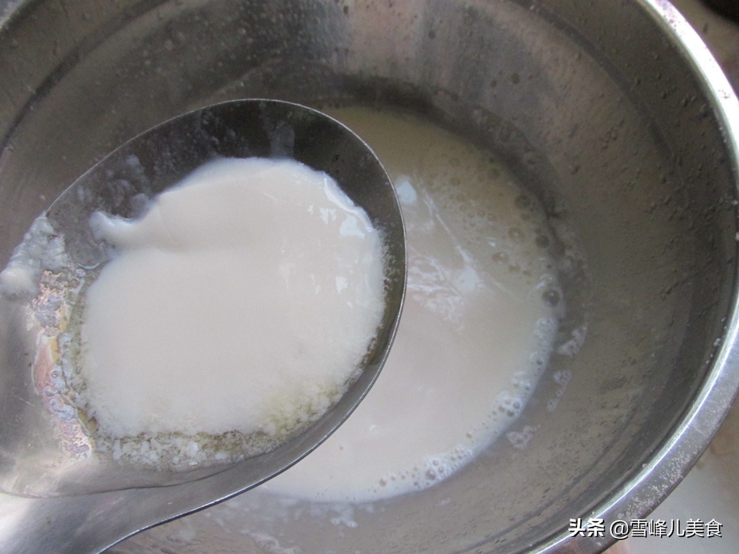 第三步:把煮开的豆浆倒入盆里,葡萄糖内脂用冷水化开,趁豆浆热,倒入豆浆中,搅拌均匀,盖上盖子等待。