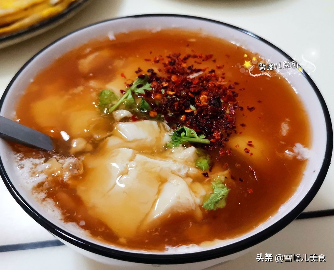 第五步:锅里加水,放上生抽,蚝油,盐,鸡精烧开,勾芡。豆腐脑舀入碗中,倒入做好的汤汁。