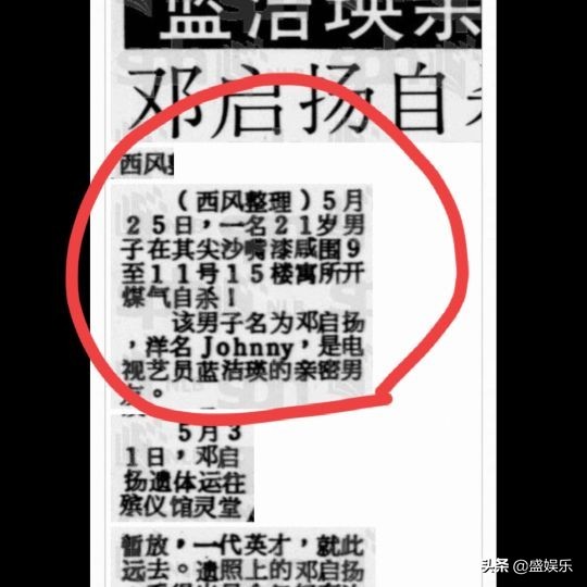 他开始否定自己,恨自己,甚至厌恶自己,仿佛瞬间就失去了人生的目标与存在的意义,俨然一个丢失了灵魂的躯壳,在一气之下,邓启杨将家中门窗紧闭,密不透风的用煤气了结了自己那“无趣”的生命。邓启扬的离开让蓝洁瑛自责不已,同时她也“斥责”这个男人的软弱。当被媒体问及时,蓝洁瑛表示与邓启杨的感情是一段谁也无法代替的过去,将永铭记于心。