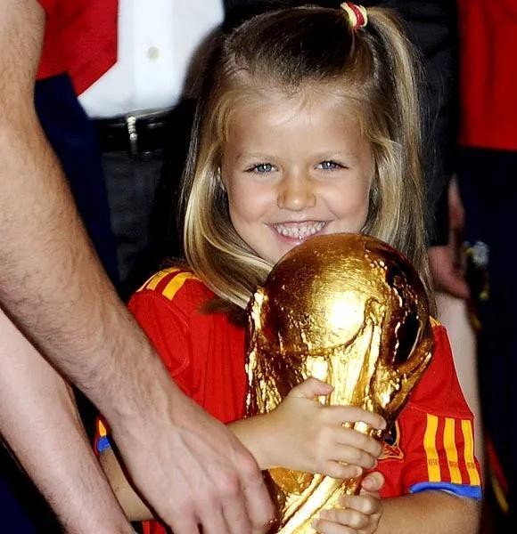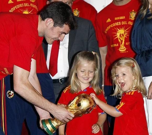 2010年还有一件令全世界沸腾的事情就是四年一度的世界杯,西班牙男足获得了2010年南非世界杯冠军,回国之后带着大力神杯造访王宫,两个小公主也出来一起玩啦,在队长卡西利亚斯的“诱导”之下,两个小公主摸了大力神杯,索菲亚小公举你这表情是认真的嘛~~