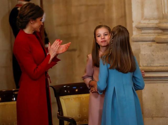 国王爸爸50岁生日,授予姐姐莱昂诺尔公主金羊毛勋章,在仪式上姐姐是主角,妹妹在旁边稍微有点落寞之色,莱蒂齐亚王后一边为大女儿莱昂诺尔公主骄傲,一边用自己的力量安慰小女儿索菲亚公主,小索儿不难过,你和姐姐都是西班牙公主,姐姐是王储,责任自然更重,但不代表你就不重要呀,上天让你们做姐妹,肯定有最好的安排~
