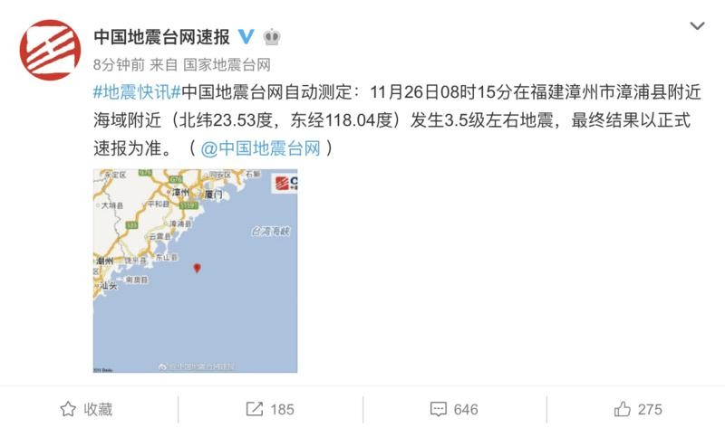 中国地震台网自动测定:11月26日08时15分在福建漳州市漳浦县附近海域附近(北纬23.53度,东经118.04度)发生3.5级左右地震,最终结果以正式速报为准。