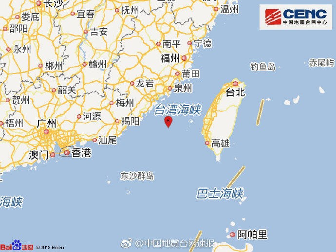 中国地震台网正式测定:11月26日07时57分在台湾海峡(北纬23.28度,东经118.60度)发生6.2级地震,震源深度20千米。